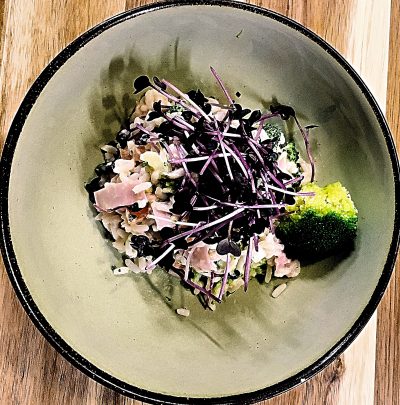 Den abgekühlten Brokkoli in unterschiedlich große Röschen teilen und vorsichtig unter den Salat heben.