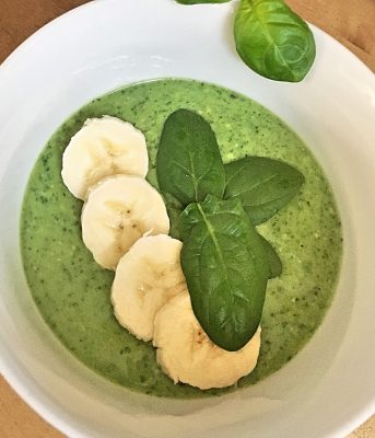 Kiwi, Banane, Basilikum, Joghurt, Kokosraspeln, Haferflocken und Spinat, bis auf die Blätter zum Garnieren, mit einem Mixer oder Pürierstab fein pürieren. Mit einem Spritzer Limettensaft abrunden.