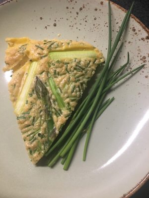 - Die Eier mit Crème fraîche, Mehl, Salz, Pfeffer, und Muskat verrühren. Den Schnittlauch unterrühren und alles in die Form geben. Die Spargelstückchen darauf verteilen.
