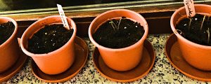 Und noch ein neues Projekt steht an. Ich habe mir vorgenommen, mit selbst gezogenen Kräutern zu kochen. Also sieht meine Fensterbank jetzt so aus: