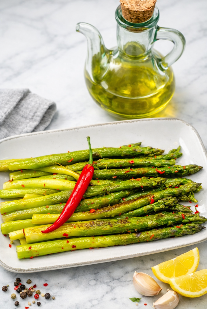 Als Beilage dient heute grüner gerösteter Spargel, abgerundet mit leichter Schärfe.